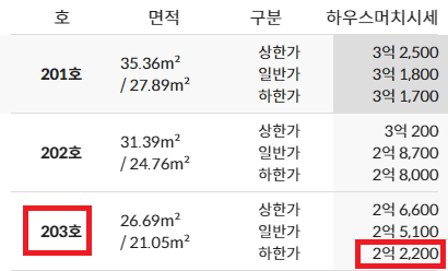 예시로 든 세대 건물정보를 바탕으로, 직방에 등록된 매물은 203호이겠네요.