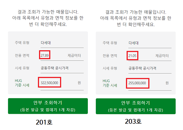 HUG에서 조회한 203호는 255,000,000원 KB부동산시세는 222,000,000