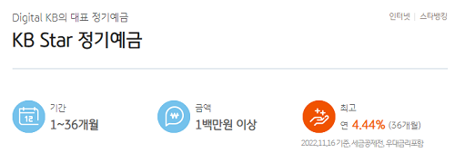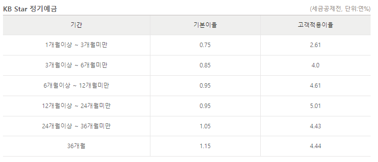 | KB국민 | 5.01% | KB Star 정기예금 | 100만 원 이상 | 1~36개월 |