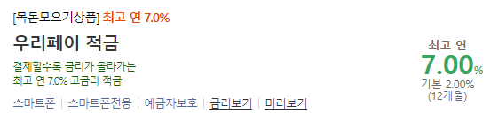 우리은행도 마찬가지로 우리페이로 결제했을 시 최고 7%까지 받을 수 있는 적금 상품이 있었어요.