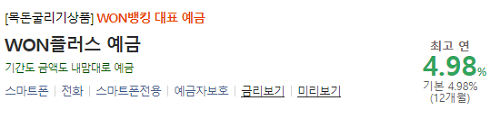 | 우리은행 | 4.98% | WON플러스 예금 | 100만 원 이상 | 1~36개월 |