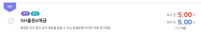 | 농협은행 | 5% | NH올원e예금 | 10만 원 ~ 10억 | 1~36개월 |