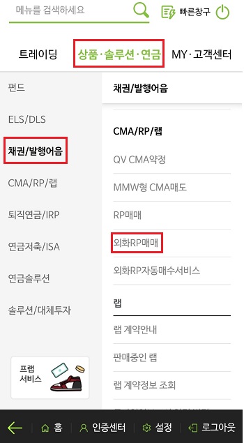 우선, 외화 RP를 가입하기 위해서 아래 사진 처럼 상품·솔루션·연금 탭을 눌러줍니다.