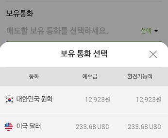 달러로 바꿀 거니까 보유하고 있는 원화를 클릭해주시면 됩니다.