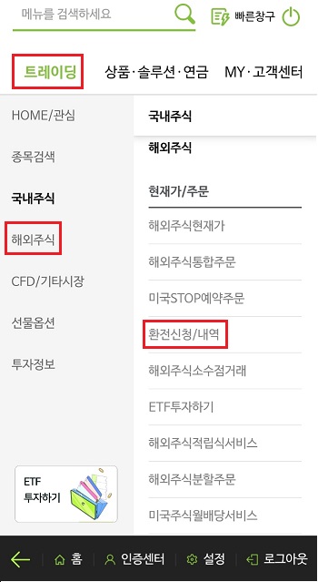 트레이딩 -> 해외주식 -> 환전신청/내역 에서 환전을 하실 수 있습니다.
