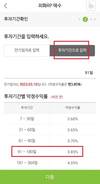 저는 30일은 좀 짧고, 세 달 정도 외화를 묶어놓고 싶기에, 91일 구간을 선택해서 가입했어요 :)