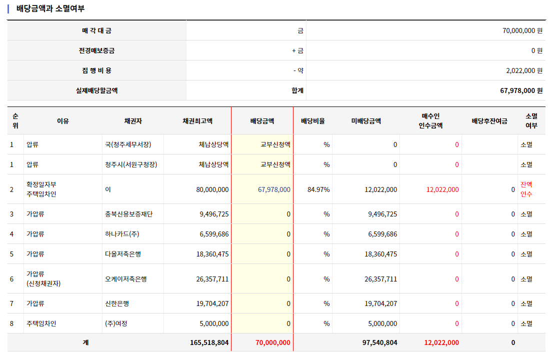 예상 배당표를 보시면, 임차인 이OO씨 위로 청주세무서와 서원구청에서 건 압류가 1순위에 있는 것을 보실 수 있습니다.