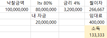 그래서 cash flow는 1억에 낙찰받았다고 가정하고 짜보겠습니다.