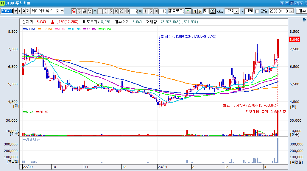 다시 돌아와, 오늘 세아메카닉스는 49백만주로 약 50백만주라는 거래량을 기록했습니다.