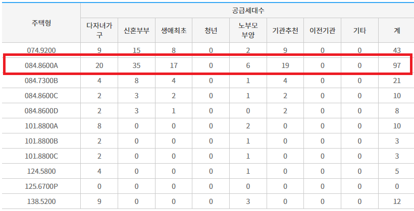 84.86㎡ A형이 가장 많은 공급세대수가 배정되어, 치열한 경쟁률을 기록할 것으로 예상합니다.