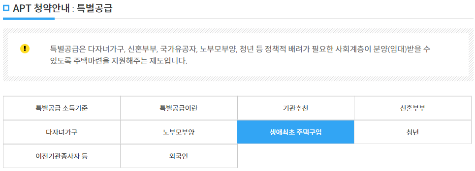 아파트 청약 특별공급 대상자는 위 사진처럼 10가지 유형으로 나뉩니다.