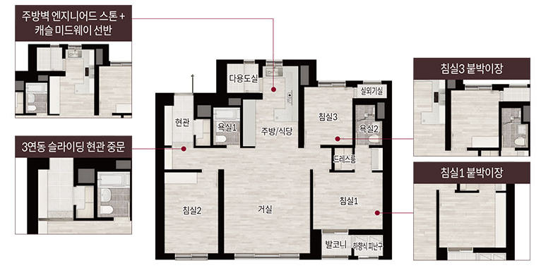 침실1은 부부 침실, 침실3은 추가 옷방으로 써도 좋을 것 같습니다.
