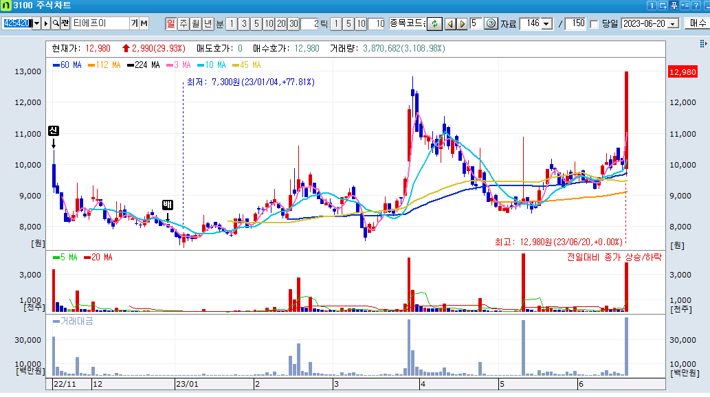 둘 다 오늘 상한가를 달성했구요, 티에프이와 흥아해운이라는 종목입니다.